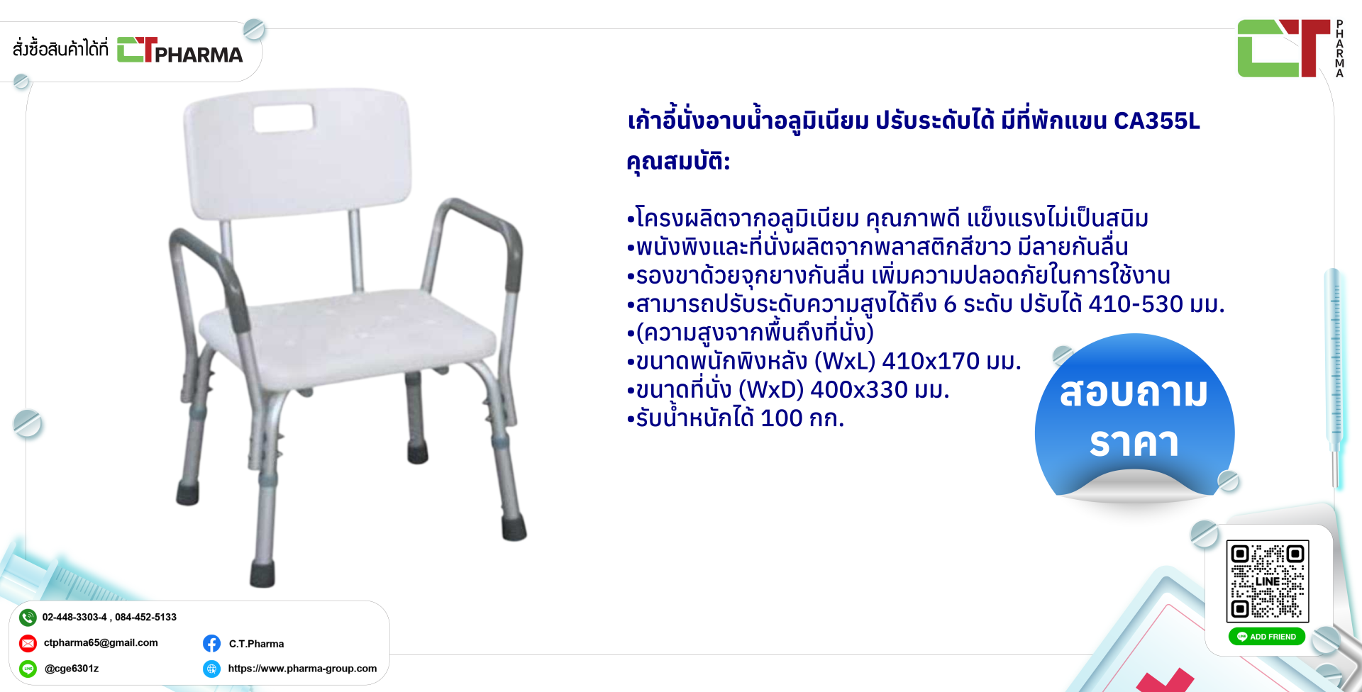 เก้าอี้นั่งอาบน้ำอลูมิเนียม ปรับระดับได้ มีที่พักแขน CA355L