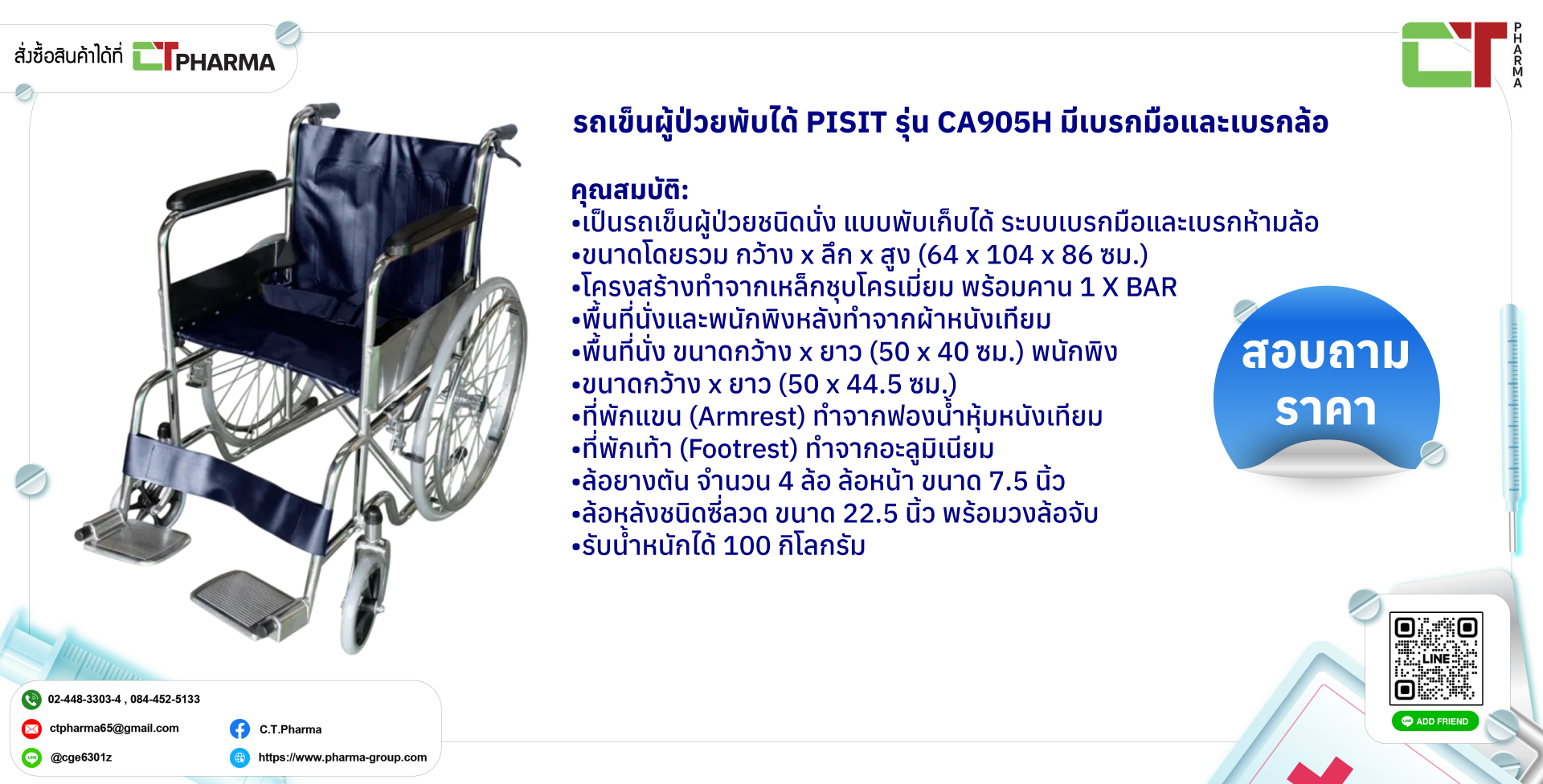 เป็นรถเข็นผู้ป่วยชนิดนั่ง แบบพับเก็บได้ ระบบเบรกมือและเบรกห้ามล้อ