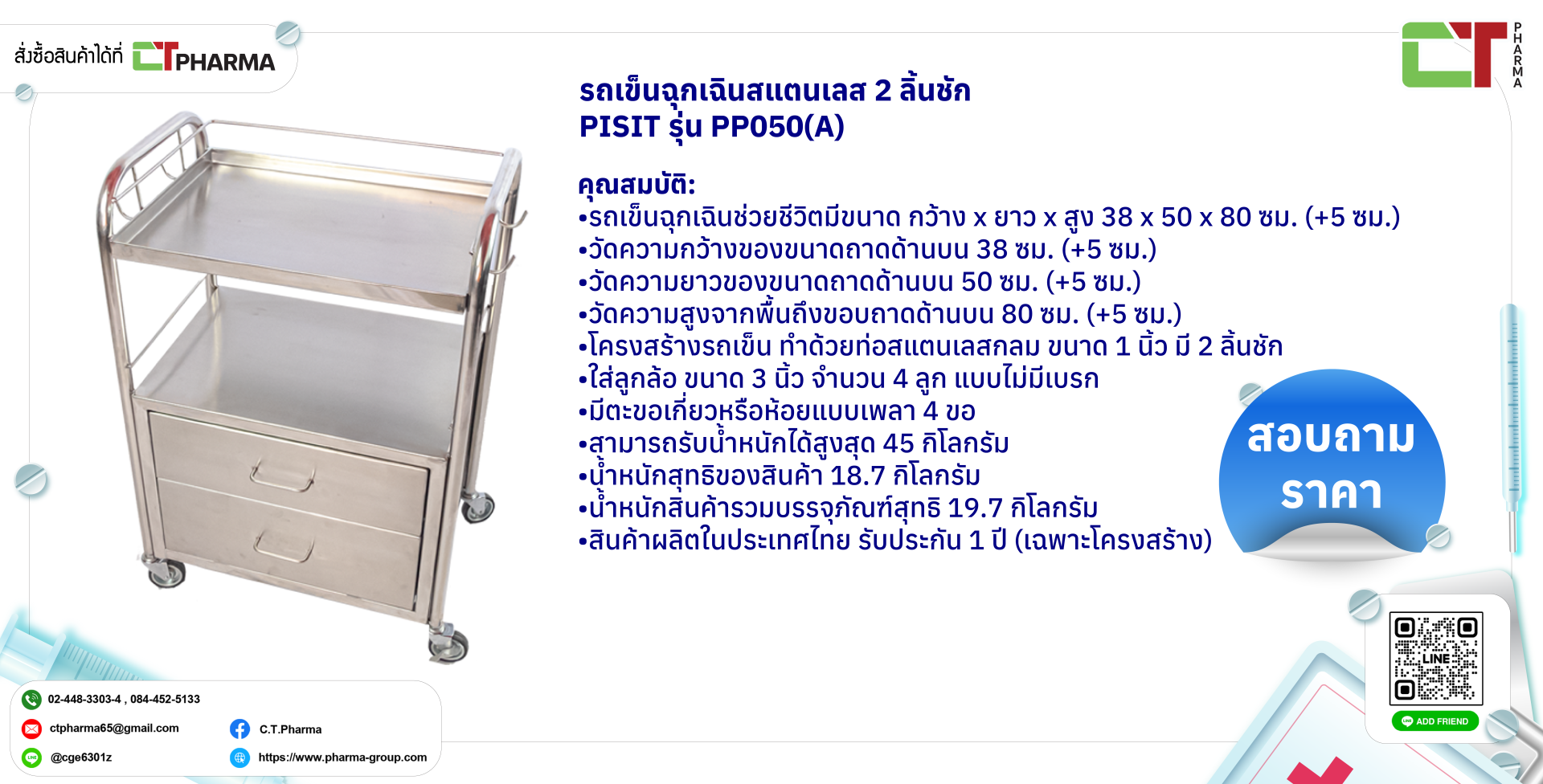 รถเข็นฉุกเฉินสแตนเลส 2 ลิ้นชัก PISIT รุ่น PP050(A)